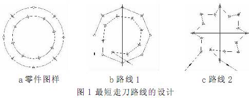 加工圖 1 中 a 圖所示為零件上的孔系。b 圖的走刀路線為先加工完外圈孔后, 再加工內(nèi)圈孔。 若改用 c 圖的走刀路線, 減少空刀時間, 則可節(jié)省定位時間近 1 倍, 從而提高了加工效率。