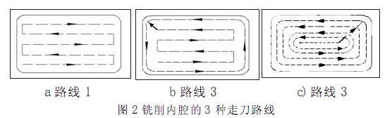 為保證工件輪廓表面加工后的粗糙度要求輪廓應(yīng)安排在最后一次走刀中連續(xù)加工出來。 見圖 2 中 a 圖所示為用行切方式加工內(nèi)腔的走刀路線, 這種走刀方法能切除內(nèi)腔中的全部余量, 不留死角, 不傷輪廓。但行切法將在兩次走刀的起點和終點間留下殘留高度而達不到表面要求的粗糙度。所以如采用圖 2 中 b 圖的走刀路線, 先用行切法, 最后沿周向環(huán)切一刀, 光整輪廓表面,能獲得較好的效果。圖 c 也是一種較好的走刀路線方式。