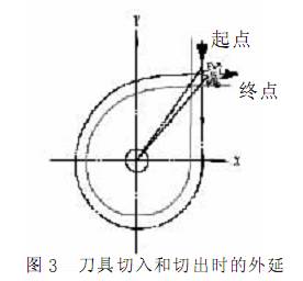 考慮刀具的進、 退刀 ( 切入、 切出) 路線時, 刀具的切出或切入點應(yīng)在沿零件輪廓的切線上, 以保證工件輪廓光滑; 應(yīng)避免在工件輪廓面上垂直上、 下刀而劃傷工件表面; 盡量減少在輪廓加工切削過程中的暫停 ( 切削力突然變化會造成彈性變形) , 以免留下刀痕見圖 3。