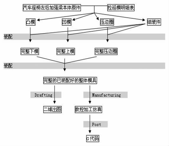 通過參數(shù)化方法建模, 首先依據(jù)汽車座椅加強梁原件的尺寸及拉延模明細表要求, 使用 UG軟件分別制作出凸模、 凹模、 壓邊圈以及各個組裝件的實體造型, 進而展開設計出完整的上模、 下模、 及壓邊圈, 再將它們逐一裝配起來, 并輸出內(nèi)容詳實的二維圖紙, 接下來利用 UG加工模塊進行數(shù)控加工仿真, 并進一步利用POST功能輸出數(shù)控加工走刀程序 G代碼。整個設計過程可由流程圖 1 來表示。