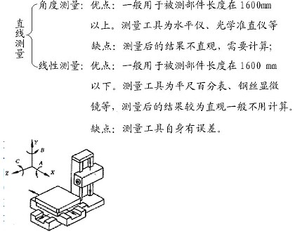 首先我認(rèn)為在我們實(shí)際裝配和調(diào)試過程中數(shù)控機(jī)床直線度測量方法通??梢苑譃橐韵聝纱箢悾阂活悶榫€性測量。即測量的基準(zhǔn)為平直實(shí)體要素。如平尺或鋼絲繩等;另一類為角度測量。即它的測量基準(zhǔn)通常采用如大地水平線或是光束等。其兩種測量方法有其優(yōu)點(diǎn)也缺點(diǎn)如下圖所示。