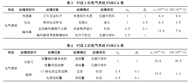 通過FMECA分析表能夠直觀地分析出哪種故障對 生產(chǎn)的危害度最大。由表3得出,時(shí)段1時(shí)的編碼器危害 度大于其他2項(xiàng),是加工中心在時(shí)段1時(shí)最應(yīng)該加以防護(hù) 的危害。在時(shí)段2時(shí),光柵尺危害度達(dá)到了 20. 8,是整個(gè) 系統(tǒng)中危害度最大的一項(xiàng),而且都是因?yàn)楣鈻懦邠p壞造成 的,在日常維修工作中還需改善光柵尺選型及定期清理等 相關(guān)工作。從時(shí)段1和時(shí)段2的FMECA分析表中得出,2 個(gè)故障器的電氣系統(tǒng)常見故障危害度并不相同,這是因?yàn)?加工中心在不同的時(shí)間段里會表現(xiàn)出不同的故障,所以, 對加工中心不同故障時(shí)期的研究是有著重要的現(xiàn)實(shí)意義 及實(shí)用價(jià)值的。