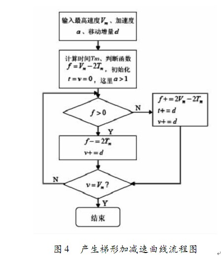 以加速階段分析: 其關(guān)系式可表示為 V = a* t。在給定最高速度 Vm 的情況下, 到達(dá)時間 Tm = Vm/a, 一般的實現(xiàn)方法是時間t 從0 開始遞增, 對應(yīng)每個t 代入式v = a* t 中計算出v, 這個方法可行但是計算量太多, 涉及到浮點運算。不利于在嵌入式系統(tǒng)中運用。為了提高運算的效率, 減小浮點運算量, 利用插補(bǔ)算法, 以數(shù)字方式實現(xiàn)運動過程。采用最小偏差法, 來實現(xiàn)直線運動, 軟件實現(xiàn)其過程的流程圖如圖4 所示。