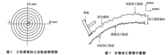 補(bǔ)償加工軌跡示意圖如圖 3所示.補(bǔ)償加工前,要根據(jù)砂輪的初始加工軌跡,擬合出一條連續(xù)的誤差曲線, 擬合曲線與理想軌跡(由非球面公式計算得到)之差就是補(bǔ)償加工的進(jìn)給量.