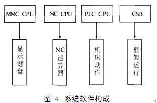 MMC-CPU基于人機(jī)界面設(shè)計,負(fù)責(zé)輸入、 顯示輸出等,系統(tǒng)軟件為W i ndow s操作系統(tǒng),便于與外部軟硬件的接口,統(tǒng)一的通訊協(xié)議,并可以擔(dān)當(dāng)復(fù)雜數(shù)學(xué)運算, 提供良好其他高級編程語言的平臺. NC-CPU基于數(shù)控運算控制. PLC-CP U由西門子可編程器 S tep7設(shè)計,負(fù)責(zé)機(jī)床運動控制, 主要參與邏輯開關(guān)量的控制,完成機(jī)床的輔助協(xié)調(diào)控制. CSB-CPU基于多 CP U并行運行的控制理念,負(fù)責(zé) CP U之間的協(xié)調(diào)工作.