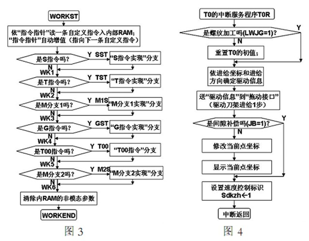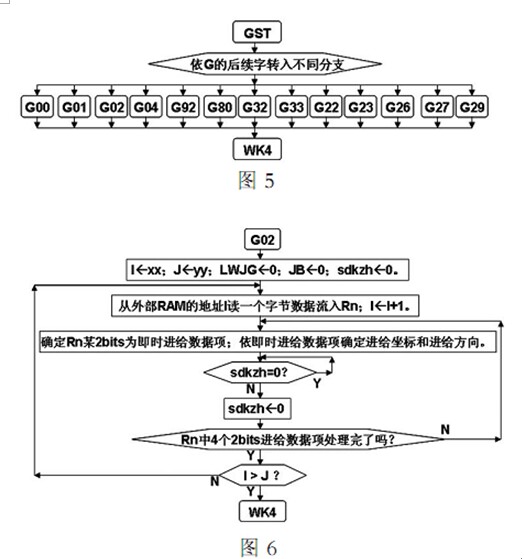 6 為圖 5 G02 分支框圖 圖中的標(biāo)識 sdkzh 由圖 4 置位sdkzh 1 表示刀架已進(jìn)給一步(10-2mm) 4 為定時器 0 中斷服務(wù)程序 它控制加工速度 刀架進(jìn)給和即時坐標(biāo)顯示
