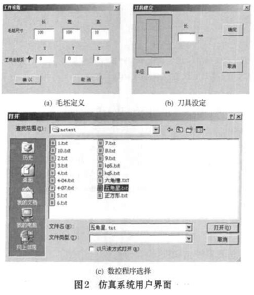 本仿真系統(tǒng)可通過兩個(gè)對話框定義毛坯的長L W、 H、 工作坐標(biāo)系X Y、 Z以及刀具的規(guī)格直徑Ф、 對刀長度L用戶可通過一個(gè)文件對話窗體選擇數(shù)控程序PRO。具體的窗體界面如圖2所示。