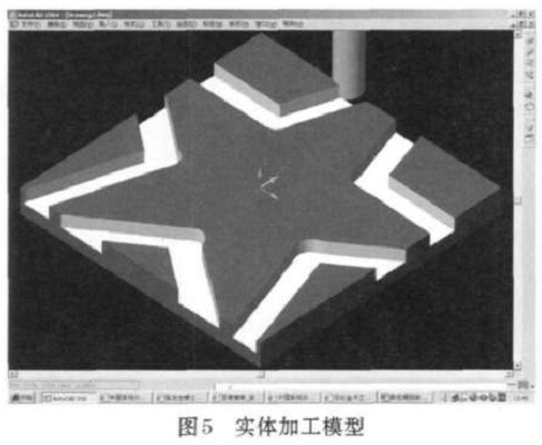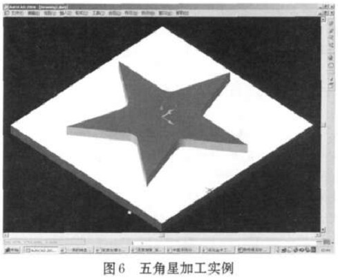 例如, 用戶定義一個(gè)矩形毛坯, 和一個(gè)半徑為10個(gè)單位的外形銑刀, 加工一個(gè)五角星的案例, 其加工完成后的效果如圖6所示。
