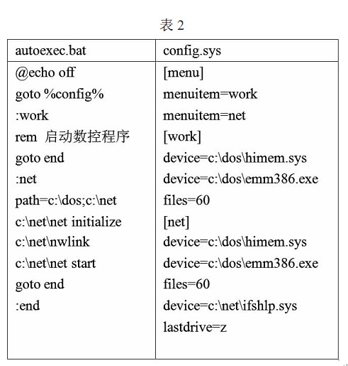 客戶(hù)端計(jì)算機(jī)如果是帶有 Windows 操作系統(tǒng)的計(jì)算機(jī),那么網(wǎng)卡的安裝與網(wǎng)絡(luò)參數(shù)設(shè)置同上,不用設(shè)置共享文件夾工作組名稱(chēng)一定要相同,IP 地址應(yīng)該在同一網(wǎng)段,這樣客戶(hù)端用戶(hù)就可以通過(guò)訪問(wèn)服務(wù)器端計(jì)算機(jī)上的共享文件夾直接獲取所需數(shù)控文件 如果客戶(hù)端計(jì)算機(jī)是 DOS 操作系統(tǒng),那么就需要安裝 MS Client 軟件來(lái)配置計(jì)算機(jī) MS Client 軟件的安裝盤(pán)有兩張軟盤(pán),一般只用到第一張 將所用網(wǎng)卡的 NDIS網(wǎng)卡驅(qū)動(dòng)程序 *.DOS 復(fù)制到此軟盤(pán)內(nèi),MS Client 軟件安裝網(wǎng)卡時(shí)要用到 運(yùn)行安裝程序,按照安裝程序的提示依次輸入所需信息 注意工作組和用戶(hù)的名字一定要與服務(wù)器端設(shè)置的名字一致,通信協(xié)議 (protocol ) NetBEUI 必選,如果是 ISA總線的網(wǎng)卡,還需要設(shè)置中斷號(hào)和 I/O 地址 安裝完成后系統(tǒng)會(huì)在根目錄下生成新的 AUTOEXEC.BAT 和 CONFIG.SYS 文件,為了工控機(jī)正常運(yùn)行需要將其配置為多任務(wù)啟動(dòng)方式在需要傳輸文件時(shí)系統(tǒng)進(jìn)入聯(lián)網(wǎng)模式,不需要是關(guān)閉網(wǎng)絡(luò)連接,釋放系統(tǒng)資源提高系統(tǒng)運(yùn)行速度 假設(shè) MS Client 軟件安裝在 c:\net 文件夾內(nèi),那么文件內(nèi)容如表2所示