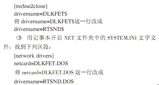 ( 1 ) 將磁盤(pán)中 NET 文件夾原來(lái)的DFE530-TX 網(wǎng)卡驅(qū)動(dòng)程序刪除 (文件名為DLKFET.DOS),將RTL8139 的 NDIS 網(wǎng)卡驅(qū)動(dòng)程序RTSND.DOS 復(fù)制到此 NET 文件夾內(nèi)