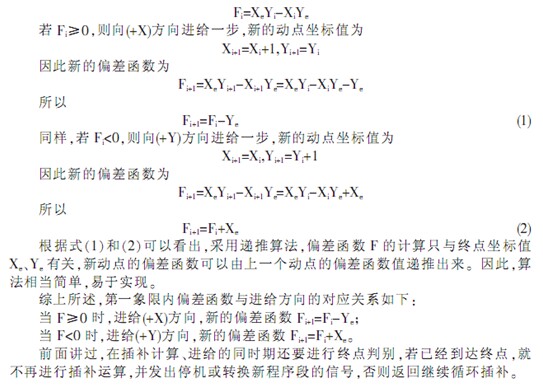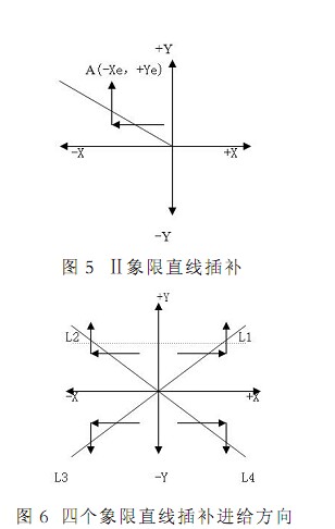 如果直接利用圖 7 來(lái)插補(bǔ)四個(gè)坐標(biāo)軸直線時(shí) 將會(huì)造成較大的插補(bǔ)誤差 顯然不太理想 為此 可對(duì)這四種特殊情況進(jìn)行專門處理 即當(dāng)判出是插補(bǔ)四個(gè)坐標(biāo)軸直線時(shí) 可將(+X)軸直線插補(bǔ)歸入(+X)進(jìn)給方向類 (-X)軸直線插補(bǔ)歸入(-X)進(jìn)給方向類 (+Y)軸直線插補(bǔ)歸入(+ Y)進(jìn)給方向類 (-Y)軸直線插補(bǔ)歸入(-Y)進(jìn)給方向類 這樣可將其插補(bǔ)誤差減小到零