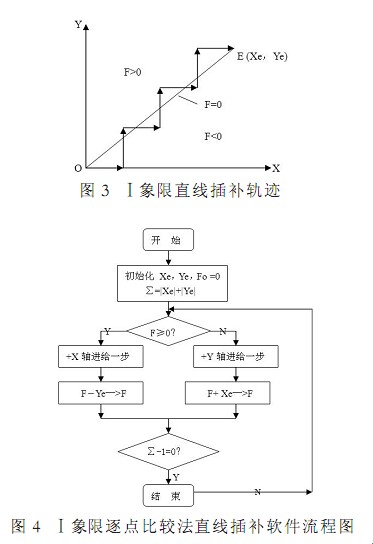 在圖 3 OE 為要加工的直線輪廓 而動(dòng)點(diǎn) N(Xi,Yi)對(duì)應(yīng)切削刀具的位置當(dāng)?shù)毒咛幱谥本€下方區(qū)域時(shí)(F<0) 當(dāng)?shù)毒咛幱谥本€上方區(qū)域時(shí)(F>0) 為了更靠攏直線輪廓 則要求刀具向(+X)方向進(jìn)給一步 當(dāng)?shù)毒哒锰幱谥本€上時(shí)(F=0)根據(jù)上述原則從 O(0 0)開始 走一步 算一算 判別 F 符號(hào) 再趨向直線進(jìn)給 步步前進(jìn) 直至終點(diǎn) E 這樣 通過(guò)逐點(diǎn)比較的方法 控制刀具走出一條盡量接近零件輪廓直線的軌跡 如圖 3 中折線所示 當(dāng)每次進(jìn)給的臺(tái)階(即脈沖當(dāng)量)很小時(shí) 就可將這條折線近似當(dāng)作直線來(lái)看待 顯然 逼近程度的大小與脈沖當(dāng)量的大小直接相關(guān)為了簡(jiǎn)化運(yùn)算 通常采用遞推法 即每進(jìn)給一步后新加工點(diǎn)的加工偏差值通過(guò)前一點(diǎn)的偏差遞推算出