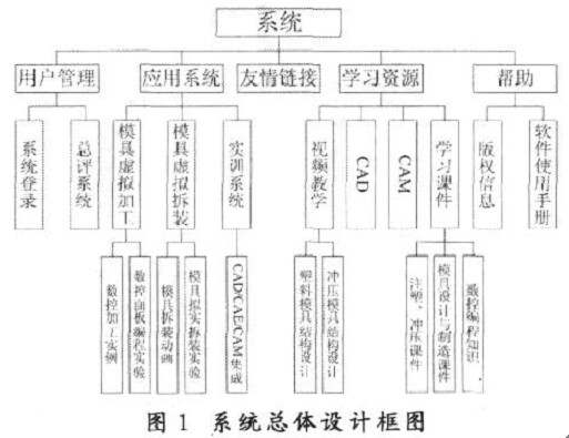 虛擬仿真實(shí)驗(yàn)系統(tǒng)將虛擬實(shí)驗(yàn)技術(shù)和模具擬實(shí)拆裝引入模具設(shè)計(jì)與制造模塊中,添加有關(guān)模具加工、模具裝配,模具結(jié)構(gòu)設(shè)計(jì)和CAD、CAM等視頻資料,建立數(shù)字化模具設(shè)計(jì)與制造綜合實(shí)驗(yàn)平臺(tái)。通過(guò)計(jì)算機(jī)虛擬實(shí)驗(yàn),可以有效地減少設(shè)備投資和實(shí)驗(yàn)時(shí)間、強(qiáng)化學(xué)生的學(xué)習(xí)效果[4]。系統(tǒng)總體設(shè)計(jì)模塊分類(lèi)如圖1所示,其中反映了本系統(tǒng)包含的模塊和要設(shè)計(jì)的主體內(nèi)容。