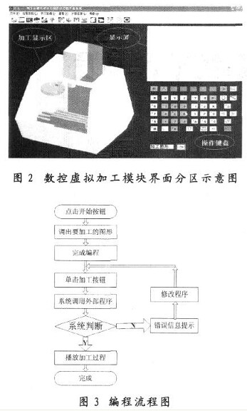 數(shù)控虛擬加工模塊界面分為三個(gè)區(qū)域,分別為數(shù)控加工顯示區(qū),編程操作鍵盤(pán)和程序顯示屏,如圖2所示。單擊編程開(kāi)始按鈕“M”,程序顯示屏顯示程序名,即可以進(jìn)行數(shù)控編程,其工作方式按圖3流程圖進(jìn)行。