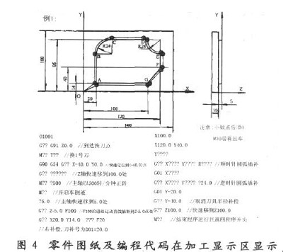 單擊圖形顯示按鈕“后退”,在顯示區(qū)顯示要加工的零件圖紙,然后根據(jù)圖紙和加工路線(xiàn),結(jié)合現(xiàn)有編程代碼,完成數(shù)控編程。單擊“后退”按鈕,零件圖紙及編程代碼在加工顯示區(qū)顯示出來(lái),如圖4所示。