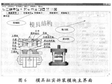 模具擬實(shí)拆裝模塊界面分為三個(gè)區(qū)域,即控制區(qū)、練習(xí)區(qū)和顯示區(qū),如圖6所示。