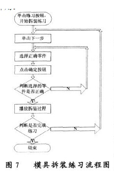 當(dāng)單擊按鈕“安裝演示”,在顯示區(qū)播放模具的安裝步驟和安裝過(guò)程。單擊按鈕“拆卸演示”,在顯示區(qū)播放模具的拆卸步驟和拆卸過(guò)程。通過(guò)觀看演示,懂得實(shí)例模具的拆裝步驟,為進(jìn)一步練習(xí)奠定基礎(chǔ)??赐昴>甙惭b演示后,接下來(lái)是模具的安裝練習(xí)。通過(guò)觀看安裝演示后,知道安裝步驟和安裝的具體過(guò)程,這樣學(xué)生就有感性的認(rèn)識(shí)。單擊“安裝練習(xí)”按鈕后,激活練習(xí)區(qū)中的各按鈕,開(kāi)始模具的安裝練習(xí)。單擊“下一步”按鈕,步驟區(qū)顯示模具安裝步驟,提示區(qū)顯示練習(xí)的提示(提示選擇多少個(gè)零件),在零件區(qū)里根據(jù)步驟選擇正確的零件,單擊“確定”按鈕,系統(tǒng)自動(dòng)判斷選擇的零件是否正確,正確的在顯示區(qū)播放安裝過(guò)程,錯(cuò)誤的重新選擇。其練習(xí)流程圖如圖7所示。