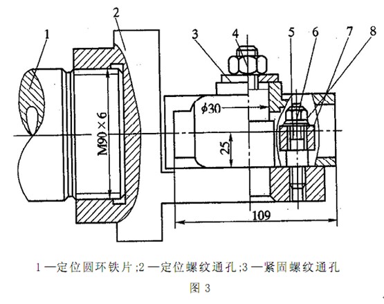 為保證該尺寸, 我們可在角鐵放置工件的基準平面處( 如圖 1 -2箭頭所示) 鎖緊一高為 3 mm, 直徑為Φ 83 mm 的圓環(huán)鐵片,如圖 1 -3所示。該圓環(huán)鐵片與壓緊螺栓螺母、定位螺栓螺母( 如圖1 -2 的3 、 4 、5 、6 、7 、8所示) 一起緊固工件, 提高工件的定位精度, 并且防止工件在加工過程中偏移, 以保證加工精度。
