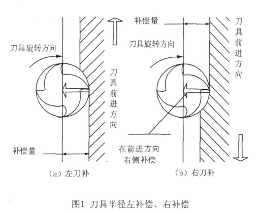 刀具半徑補(bǔ)償?shù)闹噶罡袷綖?/span>: G41 D ; G42D . G41 是刀具半徑左補(bǔ)償指令 , 順著刀具直線前進(jìn)的方向看 , 刀具在左邊 , 工件在右邊 , 此時(shí)刀心在工件的左邊, 離工件的輪廓相差一個(gè)刀具半徑值, 需對(duì)刀具進(jìn)行左補(bǔ)償, 補(bǔ)償值用 D 及后面的號(hào)碼確定.G42為刀具半徑右補(bǔ)償指令, 順著刀具直線前進(jìn)的方向看, 刀具在右邊, 工件在左邊, 此時(shí)刀心在工件的右邊,離工件的輪廓相差一個(gè)刀具半徑值, 需對(duì)刀具進(jìn)行右補(bǔ)償, 補(bǔ)償值用D及后面的號(hào)碼確定[1 ](如圖1) .