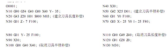 由上例可知 , 加入刀具半徑補(bǔ)償和長(zhǎng)度補(bǔ)償功能后 , 數(shù)控編程均可按圖形輪廓的尺寸進(jìn)行.