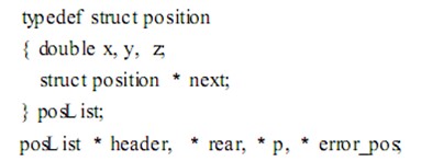 此模塊主要用來實(shí)現(xiàn) NC文件的數(shù)據(jù)讀入。 數(shù)控加工刀軌仿真的關(guān)鍵就是從 NC文件中讀取三軸聯(lián)動加工信息。這些加工信息主要包括 G功能代碼和尺寸字。本文根據(jù)三軸聯(lián)動的實(shí)際特性 ,只對以下三組常用代碼作相應(yīng)的處理: G00~G O2; G17~G19; G90, G91。系統(tǒng)在讀入 NC文件之后 ,需將NC文件數(shù)據(jù)轉(zhuǎn)化為仿真所需的坐標(biāo)點(diǎn) ,并存儲到鏈表中[ 1 ]。鏈表結(jié)構(gòu)如下: