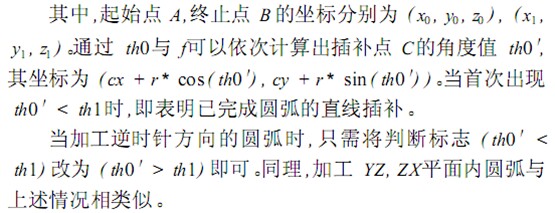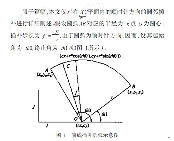 根據(jù)坐標(biāo)值前的 G代碼不同作出相應(yīng)的處理:若為直線加工指令 (GO1) ,直接將端點(diǎn)坐標(biāo)值添加到鏈表當(dāng)中;若為圓弧加工指令 (GO2, GO3) ,則以進(jìn)給量當(dāng) (即插補(bǔ)步長 ) f為步長,用直線插補(bǔ)來近似圓弧,并將所有直線段的端點(diǎn)坐標(biāo)值添加到鏈表當(dāng)中。