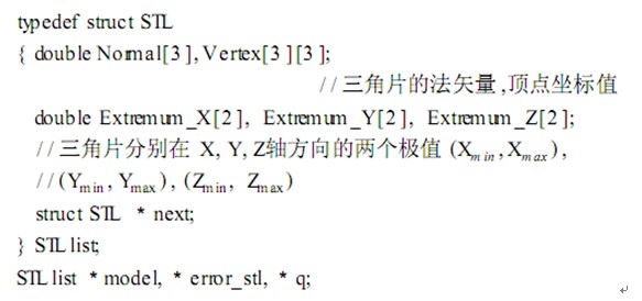 在 ST L文件中所有三角面片被無序列出 ,相互之間不存在任何拓?fù)湫畔?/span> , 這將導(dǎo)致刀位點(diǎn)到模型的最短距離計(jì)算過程相當(dāng)困難。 因此 ,重建零件 ST L模型的拓?fù)湫畔⑹欠浅1匾摹?/span> 在讀入零件的 ST L模型數(shù)據(jù)時,依據(jù)三角面片的 Z方向的極大值進(jìn)行排序,從大到小依次保存到鏈表當(dāng)中。 同時,為了簡化后續(xù)數(shù)據(jù)計(jì)算過程,在鏈表中設(shè)計(jì)了兩個數(shù)組用來保存三角面片在 XY投影面上的四個極值。 鏈表結(jié)構(gòu)定義如下:
