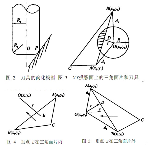 當(dāng)三軸數(shù)控銑床使用球頭銑刀加工曲面時,加工對象輪廓上的所有點(diǎn)到刀具軸線的距離不小于刀具半徑R,是不發(fā)生干涉的充要條件。 考慮到三軸數(shù)控銑床加工特點(diǎn),刀具在加工過程中可能發(fā)生最典型的干涉有:(1) 全干涉,即刀具碰撞曲面; (2) 局部干涉,即導(dǎo)致工件材料被過切。對于第一種干涉情形: 由于加工曲面已被三角化的 ST L模型替代,因此,只有 Zmax不小于刀位點(diǎn)坐標(biāo) ( x, y, z) 的 z值的三角面片才是可能會發(fā)生全干涉的區(qū)域。 三角面片和刀具在 XY投影平面的形狀分別為三角形和圓,如圖 3所示。 通過比較圓心 O到三角形 △ABC的最短距離 r和刀具半徑 R大小,就可以判斷此類干涉是否發(fā)生。