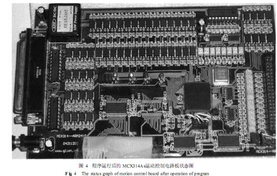 MCX314As運(yùn)動(dòng)控制板上設(shè)計(jì)的四個(gè) LED指示燈來顯示數(shù)控運(yùn)動(dòng)控制系統(tǒng)控制的四個(gè)軸的運(yùn)行狀態(tài) ,然后通過編寫簡單的驅(qū)動(dòng)程序 ,發(fā)送簡單的指令控制 MCX314As進(jìn)行插補(bǔ)動(dòng)作 ,通過 LED指示燈的狀態(tài) ,來驗(yàn)證數(shù)控系統(tǒng)的工作狀態(tài)是否與編寫的驅(qū)動(dòng)程序一致 ,這樣就可以檢驗(yàn)數(shù)控系統(tǒng)硬件和軟件的正確性 ,完成我們嵌入式數(shù)控系統(tǒng)初期的整體調(diào)試。把驅(qū)動(dòng)程序的可執(zhí)行文件下載到 ARM9主控板 ,進(jìn)行驅(qū)動(dòng) ,控制 MCX314As運(yùn)動(dòng)控制板 ,得到的運(yùn)動(dòng)控制電路板狀態(tài)如圖 4所示 ,LED發(fā)光二極管只亮了左邊兩個(gè) ,說明只有 X軸和 Y軸在運(yùn)動(dòng)。