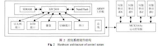 體系硬件渠道由 ARM9 S3C2410主控板和 MCX314As運(yùn)動(dòng)控制板構(gòu)成 ,這樣分隔規(guī)劃有利于使整個(gè)數(shù)控體系的硬件體系結(jié)構(gòu)及各個(gè)模塊的接口模塊化和標(biāo)準(zhǔn)化。為將來(lái)模塊或許體系的硬件維護(hù)和升級(jí)帶來(lái)極大的方便。