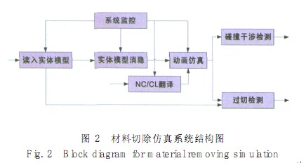 對于材料切除過程仿真, 國內(nèi)外也有一些研究成果, 主要集中在相應的算法方面。 如基于 Z- map 結(jié)構(gòu)的算法[11]、 基于 Dexel 模型的快速成型算法[12], 等等。總的來說, 材料切除過程的仿真主要有兩個功能: 一是檢測是否過切、 干涉、 碰撞, 以檢測 NC代碼和刀位文件的正確性; 二是通過逼真的三維動畫來實現(xiàn)可視化仿真, 為虛擬制造提供支撐環(huán)境。圖 2 為一個典型的材料切除仿真子系統(tǒng)的功能結(jié)構(gòu)圖。