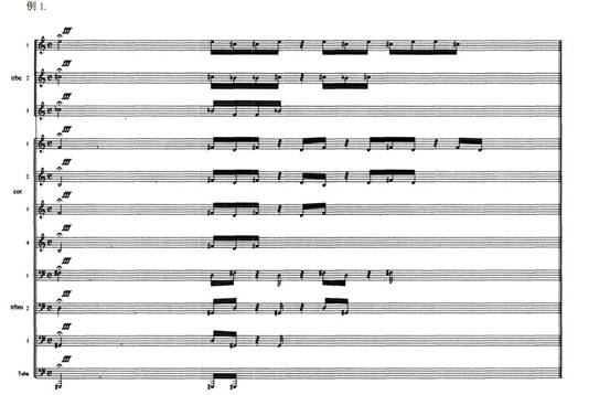 通過上例我們可以觀察到, 各聲部除了開始是一個(gè)二分音符外, 之后的節(jié)奏型主要有四種, 分別為四音組、 三音組、 二音組和一音組, 每個(gè)音組之間用休止符隔開, 按照不同的樂器組,由高到低依次遞減。