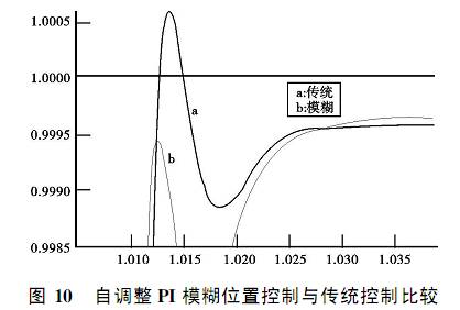 從仿真結果可以看出, 位置控制采用自調整$ kp 和$k i 的模糊控制器后,階躍響應速度快, 超調小,可以適應較大的負載,并且穩(wěn)態(tài)誤差小.