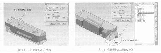 根據(jù)仿真過程的監(jiān)測, 及時發(fā)現(xiàn)了裝夾的不和性, 并在方案1 的指導(dǎo)下, 重新調(diào)整MCS 坐標系, 如圖11 所示, 并對調(diào)整后的刀具軌跡進行計算和輸出. 由此帶來的附加問題是過長的輸出程序時間.