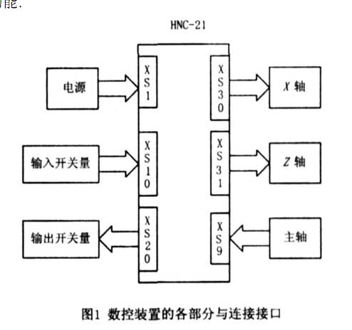 華中數(shù)控裝置作為 C6140普通車床數(shù)控改造的控制核心 , 通過D型連接器分別與電源、顯示器、主軸和進(jìn)給驅(qū)動裝置等電氣設(shè)備聯(lián)接 , 協(xié)調(diào)各部分完成數(shù)控加工. 改造過程中原有的電氣控制電路也進(jìn)行了相應(yīng)的數(shù)控改造 , 改造后的機(jī)床不僅具有控制、數(shù)顯及報警功能 , 還具有監(jiān)視機(jī)床各電氣結(jié)構(gòu)工作狀態(tài)的功能. 華中數(shù)控裝置 HNC - 21TF與主要電氣部件的聯(lián)接見圖 1 , 其中: XS1為數(shù)控裝置電源連接口 , 電源為直流24 V; XS30和 XS31為模擬脈沖接口 , 在本方案中作為 X 軸、Z 軸指令脈沖接口; XS9 為主軸控制接口; XS10和 XS20分別為輸入、輸出開關(guān)量接口.