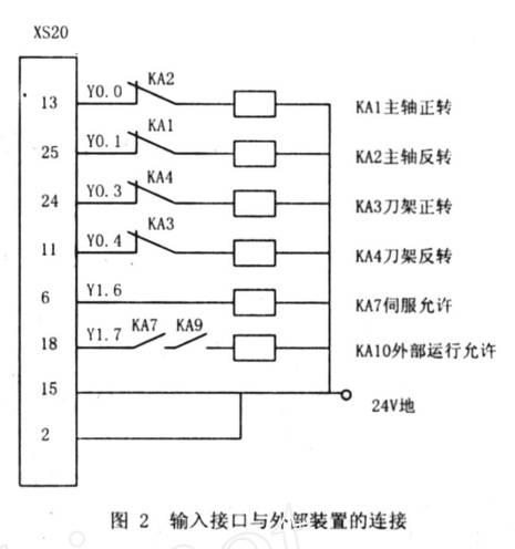 數(shù)控車床的主傳動需求較寬的調(diào)速規(guī)模和滿意的輸出力矩.依據(jù)機(jī)床需求保存原車床主軸變速箱 , 內(nèi)嵌 PLC經(jīng)過輸出開關(guān)量接口 XS20中的 Y010 和 Y011 , 別離操控主軸電機(jī)的正、回轉(zhuǎn)中心繼電器 KA1和 KA2 (KA1和 KA2連有硬件互鎖) , 電氣銜接圖見圖2 (見88頁) . 選用機(jī)械換檔辦法完結(jié)主軸有級調(diào)速 , 為使改造后的車床具有主動加工螺紋功用 , 在主軸電動機(jī)結(jié)尾設(shè)備 1024 線的增量式光電編碼器 , 使其轉(zhuǎn)速與主軸轉(zhuǎn)速共同 , 即主軸轉(zhuǎn)1周 , 光電編碼器隨之轉(zhuǎn)1周. 光電編碼器發(fā)生的速度、方向信號以脈沖辦法由 XS9主軸操控接口發(fā)給數(shù)控體系 , 數(shù)控體系依據(jù)主軸的脈沖信號操控步進(jìn)驅(qū)動設(shè)備宣布斷定的脈沖信號 , 使刀架經(jīng)過絲杠的轉(zhuǎn)向發(fā)生進(jìn)給運動 , 操控進(jìn)給軸與主軸同步 , 然后加工出所需的螺紋.