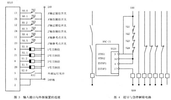 別離是設(shè)備于機(jī)床 X、Z軸超程行程開關(guān)的常閉觸點 , KA9是急停中心繼電器 , OTBS1和 OTBS2經(jīng)過 XS20接口與機(jī)床操作面板的按鍵相連 , ESTOP1和 ESTOP2與急停按鈕相連. 當(dāng)移動設(shè)備碰到超程開關(guān)時 , KA9 線圈失電 , 使圖 2 中運轉(zhuǎn)允許繼電器 KA10線圈失電 , 然后主動堵截移動設(shè)備的動力電源. 圖3中的 SQ1(SQ3)和 SQ2(SQ4)是超程開關(guān)的常開觸點 , 經(jīng)過數(shù)控設(shè)備輸入量接口 XS10與 PLC的 X010、X011、X012和 X013輸入點銜接 , 向體系宣布超程報警信息.