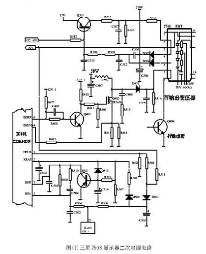 升壓型電路的優(yōu)點是對主電源的元器件耐壓要求低,影響小,采用PWM 脈寬調制,原理上二次電源直接受控于脈寬。所以絕大多數(shù)數(shù)控彩顯都采用升壓型電路,在此我們也僅討論升壓型電路原理及故障檢修。具體結合三星公司生產(chǎn)的750S多頻數(shù)控彩顯進行討論。