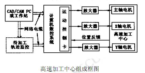 在圖1所示的高速加工中心中 , 當(dāng)計算機(jī)數(shù)控系統(tǒng)具有待加工軌跡的監(jiān)控功能時 , 則其可以直接與CAD/ CAM系統(tǒng)通過網(wǎng)絡(luò)連接 , 否則 , CAD/ CAM 系統(tǒng)生成的 NC代碼必須先通過具有待加工軌跡監(jiān)控功能的系統(tǒng) , 然后再被傳送到計算機(jī)系統(tǒng)中 , 如圖中的虛線所示。