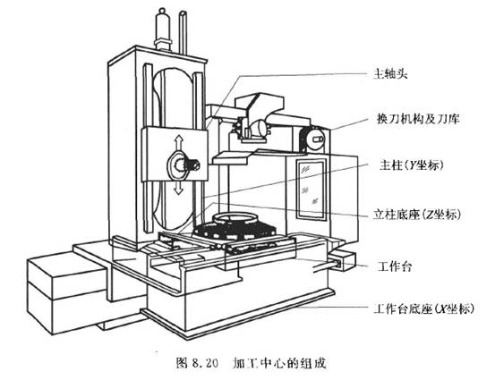加工中心由主軸頭、換刀機構(gòu)及刀庫、立柱、立柱底座、工作臺、工作臺底座等組成,如圖8. 20所示。加工中心的數(shù)控系統(tǒng)能使其按照不同工序自動選擇和更換刀具,能自動改變機床主軸轉(zhuǎn)速、進給量、刀具相對工件的運動軌跡及其他輔助功能,能依次完成.工件多個表面上多個工序的加工。