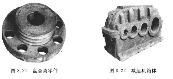 (2)箱體類零件如圖8. 22所示,箱體類零件多指具有多孔系,內(nèi)部有型腔或空腔,在長、寬、高方向有必定份額的零件。這類零件在機床、轎車、飛機等職業(yè)較多,如轎車的發(fā)動機缸體、變速箱體,減速機箱體、機床的主軸箱、柴油機缸體等。