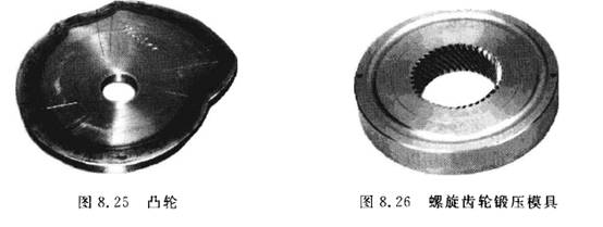 (3)模具類零件。模具常見的有鍛壓模具、鑄造模具、橡膠模具和注塑模具等。圖8. 26所示為螺旋齒輪鍛壓模具。利用數(shù)控加工中心進行模具加工時,由于工序高度集中,動模、靜模等關(guān)鍵件的精加工基本上是通過一次安裝便能全部完成,尺寸累積誤差及修配工作量小。并且模具的可復(fù)制性強,互換性好。