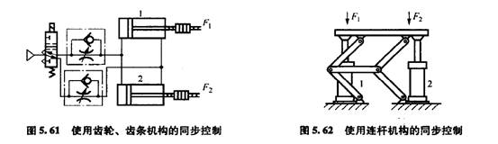 將兩只氣缸的活塞桿通過機械結構連接在一起,從理論上可以實現(xiàn)最可靠的同步動作。圖5. 61所示的同步裝置使用齒輪、齒條將兩只氣缸的活塞桿連接起來,使其同步動作。圖5. 62所示為使用連桿機構的氣缸同步裝置。對于機械連接同步控制,其缺點是機械誤差會影響同步精度,且兩只氣缸的設置距離不能太大,機構較復雜。