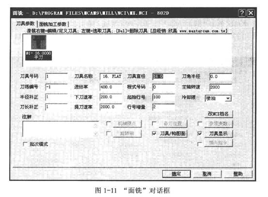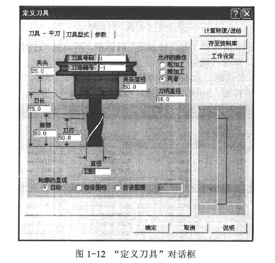 4)將鼠標(biāo)移動到##1-16平刀,單擊鼠標(biāo)右鍵,彈出“定義刀具”對話框,如圖1-12所示。