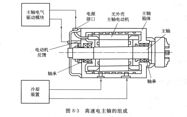 8—3所示的電主軸布局是將電機(jī)的轉(zhuǎn)子直接作為機(jī)床的主軸,主軸單元的殼體即是電機(jī)座,