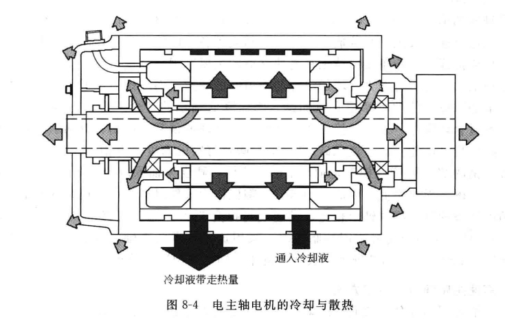 為改進電主軸的熱特性,應采取必定的辦法和設置專門的冷卻系統(tǒng)。圖84表示了電主軸電機的循環(huán)切削液冷卻和散熱路徑,在電機定子與殼體銜接處規(guī)劃循環(huán)冷卻水套,水套用熱阻較小的資料制作,套外環(huán)加工有螺旋水格。電機作業(yè)時,水槽里通人循環(huán)冷卻水,為加強冷卻作用,冷卻水的進口溫度應嚴格控制,并有必定的壓力和流量。別的,為避免電機發(fā)熱影響主軸軸承,主軸應盡量選用熱阻較大的資料,使電機轉子的發(fā)熱首要通過氣隙傳給定子,由冷卻水吸收帶走。