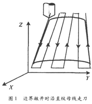 ① 當(dāng)被加工曲面的邊界敞開 ,沒有其他表面或夾具等限制時 ,為安全起見 ,應(yīng)延伸曲面邊界?;蛘咴O(shè)計一個能覆蓋被加工曲面的較大的曲面 ,使刀具從曲面的邊界外加工起。如圖 1所示 ,每次沿直線走刀 ,刀位計算簡單 ,程序段少 ,加工過程符合直紋面造型規(guī)律 ,保證母線的直線度。