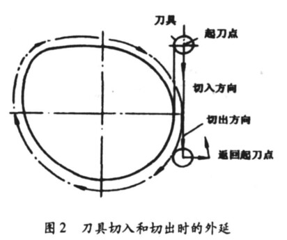③ 二維切削加工時 ,對精度要求較高的工件曲面 ,要避免法向切入工件曲面 ,而應(yīng)與工件輪廓曲面的延長線相接觸 ,然后沿該曲線切向切入工件輪