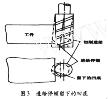 廓 ,以保證工件質(zhì)量。退刀時刀具也必須沿曲線切向退刀 ,然后再返回起點 ,見圖 2。如果沿法向切入 ,會留下明顯的刀痕。應(yīng)盡量避免在進(jìn)給中途停頓 ,引起接刀痕 ,見圖 3。如果加工時必須進(jìn)行垂直切入 /切出引導(dǎo) ,這時必須使刀具遠(yuǎn)離工件進(jìn)行切入 ,同時 ,建立刀補(bǔ) ,然后沿要求的軌跡進(jìn)行切削加工 ,當(dāng)切削完成時 ,沿切出引導(dǎo)線遠(yuǎn)離已加工工件 ,同時撤離刀補(bǔ)。應(yīng)特別注意在工件被加工曲面處垂直工件表面的方向下刀或抬刀。